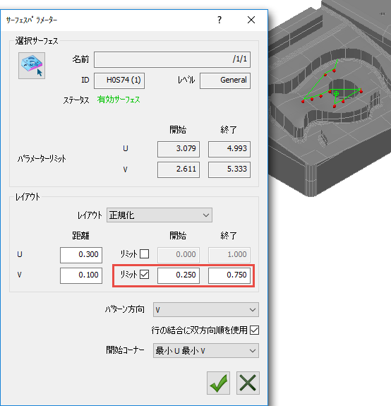 サーフェスパラメーター ダイアログの 正規化 オプションにより、モデルのサーフェスパラメーターを使用して、サーフェス上の測定ポイントの密度、および、位置を制御することができます。距離とリミットが範囲 [0,1] に正規化される点を除き、パラメーター オプションに類似しています。
