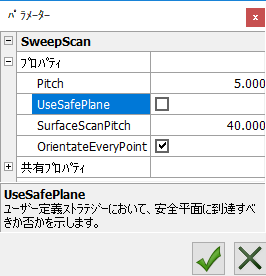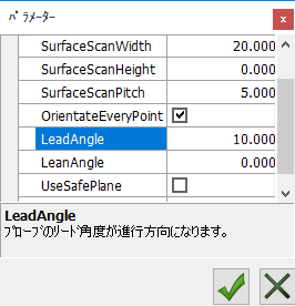 SweepScanStrip: プローブのスキャンで使用する正弦曲線的カーブを作成します。ポイントは、カーブのスパインを指定します。[パラメーター]ダイアログで、スキャンの値として SurfaceScanWidthSurfaceScanHeightSurfaceScanPitchLeadAngleLeanAngle を指定する必要があります。例: