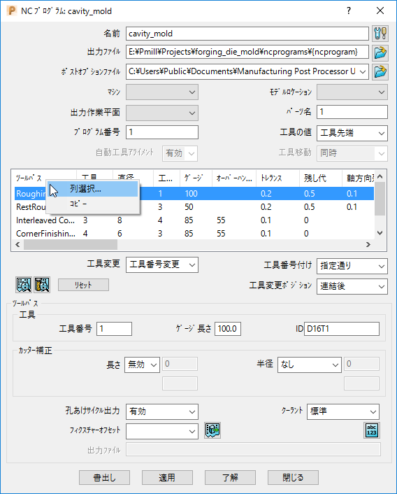 以下のように、NC プログラム、または、工具データベース ダイアログの列ビューをカスタマイズします。