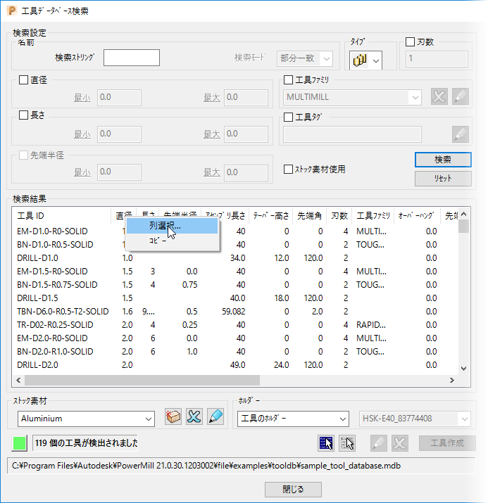 NC プログラム、または、工具データベース ダイアログからデータをコピーするには、列のヘディングを右クリックして コピー を選択します。