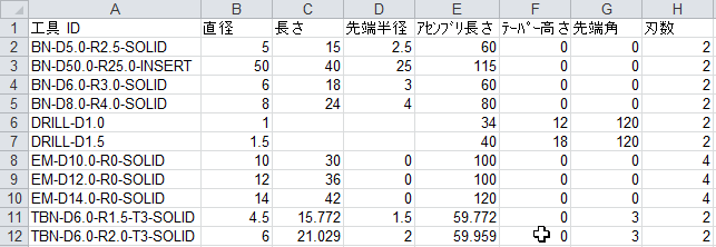 工具データベースからスプレッドシートにコピーされたデータは、次図のようになります。