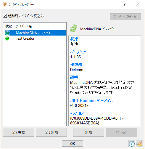 - プラグインは利用不可です。 PowerMill はプラグインを読込めないため、プラグインの詳細は表示されません。これはプラグインの破損時、または、不正登録時に発生します。プラグイン名 - 各プラグインの名称が表示されます。