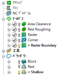 - Shallow - ロックされたバウンダリー(Raster Boundary ツールパスの作成に使用、ただし編集済み)