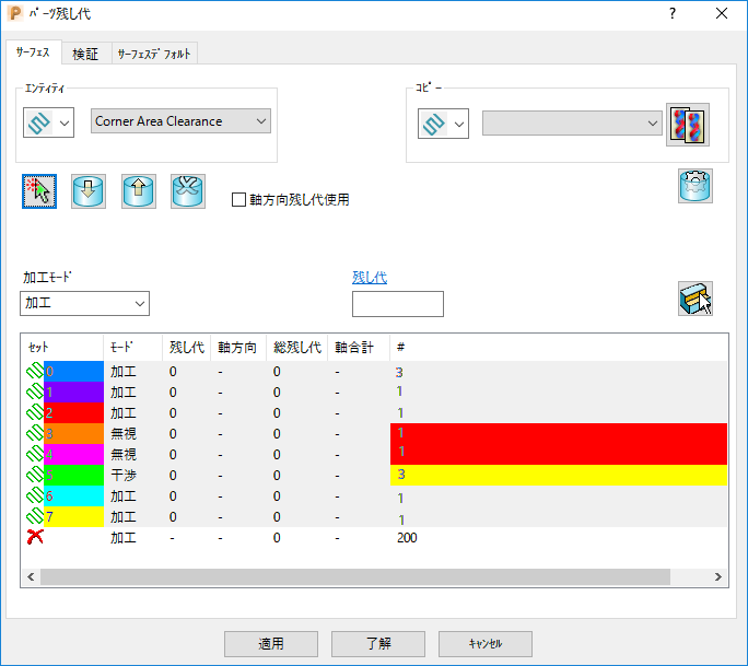 加工モード - コンポーネント残し代の適用方法を指定します。選択肢により、残し代リスト制御テーブルの モード 列に表示される色が指定されます。 次の中から選択します。