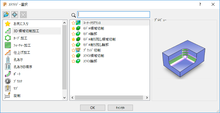 により、お気に入り フォルダーへの追加と削除を切替えます。PowerMill は、ホーム タブの お気に入り ギャラリーにも、お気に入りストラテジーを表示します。
