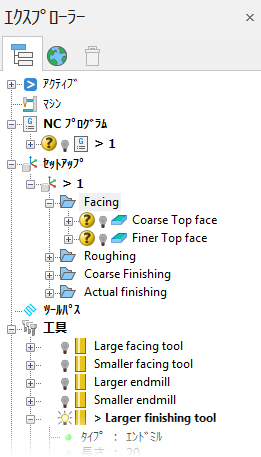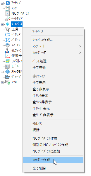 エクスプローラーの任意のエンティティ内にフォルダーを作成できますが、工具およびツールパスの整理に使用するのがおそらく最も有益な使用法と思われます。