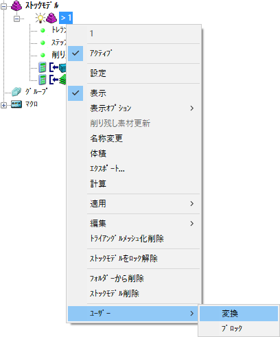PowerMill エンティティ カスタム メニュー - 任意のエンティティ コンテキスト メニューから ユーザー を選択して、カスタム メニュー コマンドを表示します。