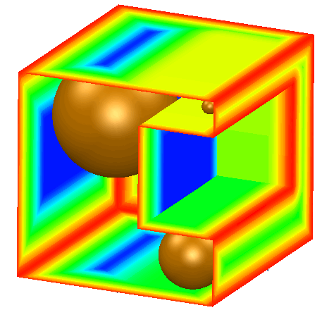 厚さは、ソリッド内の、いずれのサーフェスも通過しない可能な限り大きなボールによって計測されます。このボールはソリッド内を移動するため、スペースを埋めるように適宜、大きくなったり小さくなったりします。下のモデルの正面フェースを切取り、内部を移動する計測ボールを示します。