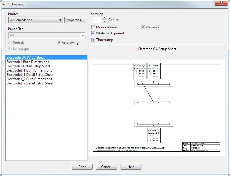 - 印刷 をクリックして、ダイアログを閉じ、ドローイングを印刷します。