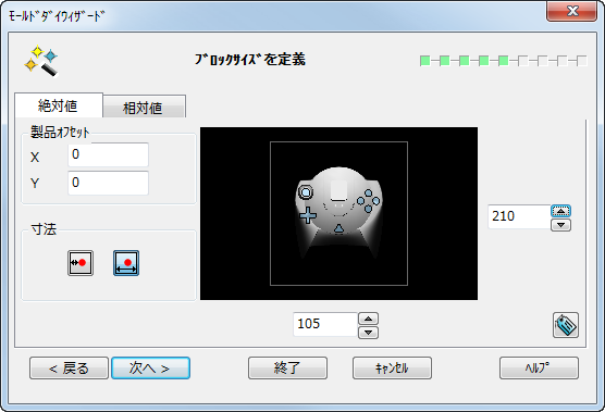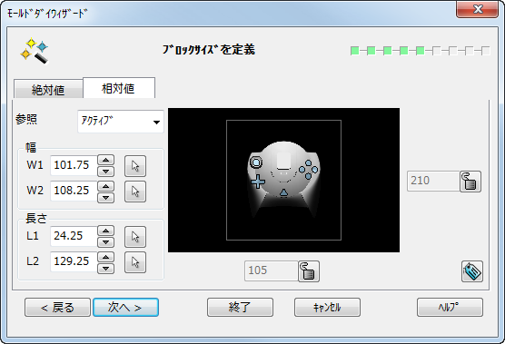 既にブロックが定義されたモールドダイ ウィザードを開始していない場合、ブロックは、選択したオブジェクトの周囲に自動作成されます。ブロック サイズは、絶対値または相対値を使用して指定することができます。このウィザードには、シェーディングされたパーツとワイヤーフレームとしてのブロックを表すイメージが含まれます。また、マウスを使用して、このイメージの回転、ズーム、およびパーンを行うこともできます。