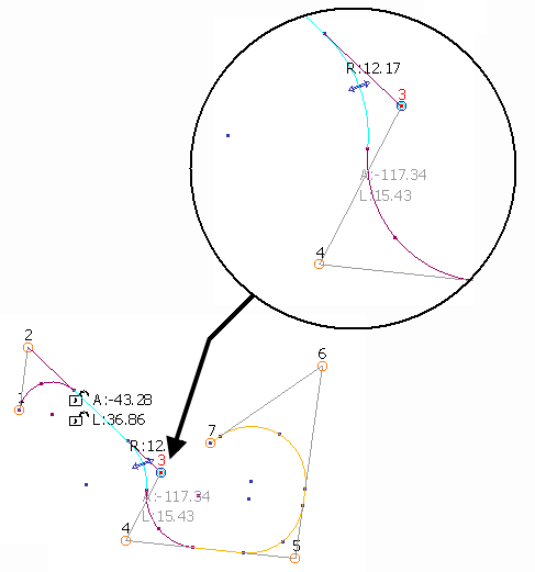 ポイント 3 を移動させると、半径を維持できなくなるまで半径 A と B は一定で、カーブを変更します。このポイント以降では、カーブの整合性を保つために、半径が適宜変更されます。