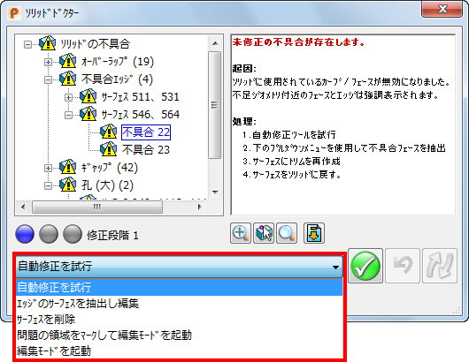 - 修正オプション - 利用可能な修正操作から、修正のオプションを選択します。詳細については、「修復オプションのリスト」を参照してください。デフォルトオプションは、自動修正を試行 です。選択した修復オプションに応じて、[ドクター編集]ツールバーが表示されます。