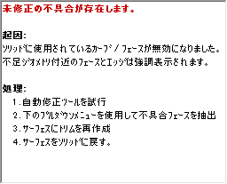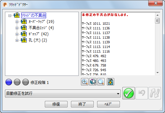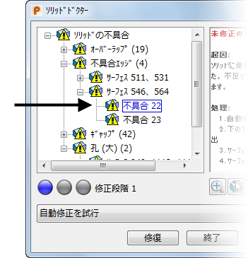 - 終了 - ダイアログを閉じて、不具合の有無を再確認します。不具合が検出されると、不具合ソリッド問合せ ダイアログが表示されます。