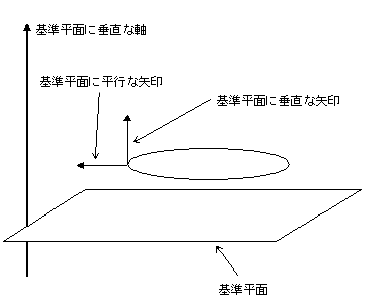 角度基準 オプションから 基準平面法線 を選択すると、次図のように一方の矢印は基準平面に平行、もう一方の矢印は基準平面に垂直な軸に平行になります。