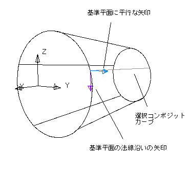 次のサーフェス上にあるコンポジットカーブを例とします。角度基準 に 基準平面法線 オプションを選択した場合、矢印は次の方向を向きます。