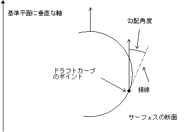 ドラフトカーブのポイントは、接線と矢印間の角度が勾配角度と同等になる位置のサーフェスに配置されます。