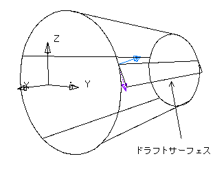 サーフェス、または、ソリッドからドラフトサーフェスを作成する場合、サーフェスから矢印が投影します。矢印は、基準平面に垂直な軸に平行で、ドラフトカーブのサーフェス上の位置を算出するため使用されます。
