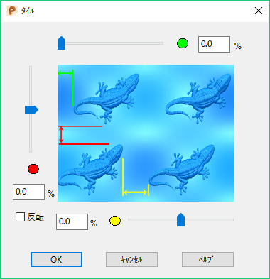 4 つのタイル設定の組合せを使用して、理想のタイル効果を作成、または、デフォルト値を使用してタイルを作成するには、値を 0 の位置のままにします。値を直接入力、または、スライダーを使用して値を設定します。