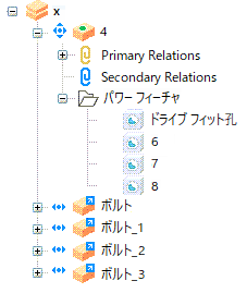 アセンブリツリーに、新規ブランチが追加されます。パワーフィーチャーのステータスは、フィーチャーの隣に示されるアイコンによって示されます。