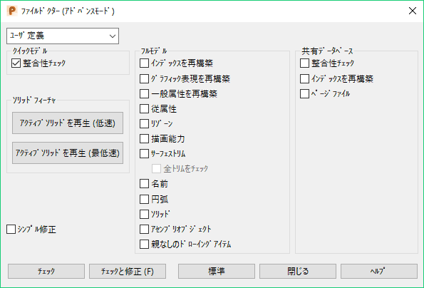 [チェックと修正]: このボタンをクリックすると、モデルにエラーがあるかどうかチェックされ、ある場合には修復されます。