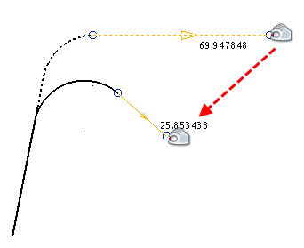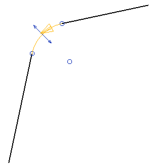 フィレット円弧は、編集結果が 2 つのラインに影響を及ぼす点を除いて、他の円弧 と同じ方法で編集されます。これは、フィレット円弧が 2 本のラインに依存することに起因します。