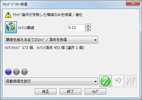 ソリッドドクター修復 ダイアログを使用して、ソリッド操作がうまくいかなかった領域を修復、または、緩化します。