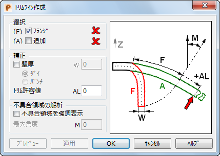 - 壁厚 - フランジの厚さを指定します。このオプションを使用して、トリムライン計算の際の厚さ(W)を使用します。