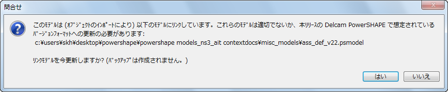 コンポーネント定義を含むモデルを開いたときに、そのソース モデルが、現行プログラムとは異なるモデル バージョン番号の PowerShape バージョンで作成されていると、[インポートされた定義をチェック]ダイアログが表示されます。これにより、次のアイテムが表示されます。