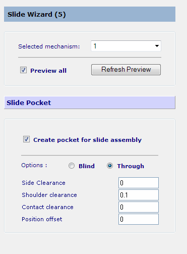 スライドアセンブリのポケットを作成 - 選択した場合、オプションパネルが表示されます。選択解除されている場合、オプションは表示されません。