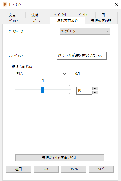[適用]: ポジションを入力します。現行操作で複数のポイントが許可される場合は、ダイアログは閉じずに、さらにポイントを入力できる状態となります。そうでない場合は、ダイアログが閉じます。