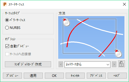 [ネットワークから]、[個別のワイヤフレームから]または[ドライブカーブ]の方法を使用する場合は、アドバンス オプション ダイアログに[ガイドを作成]ボタンが表示されます。このオプションと[スマートサーフェス]を使用して、次のようにガイドカーブを作成します。