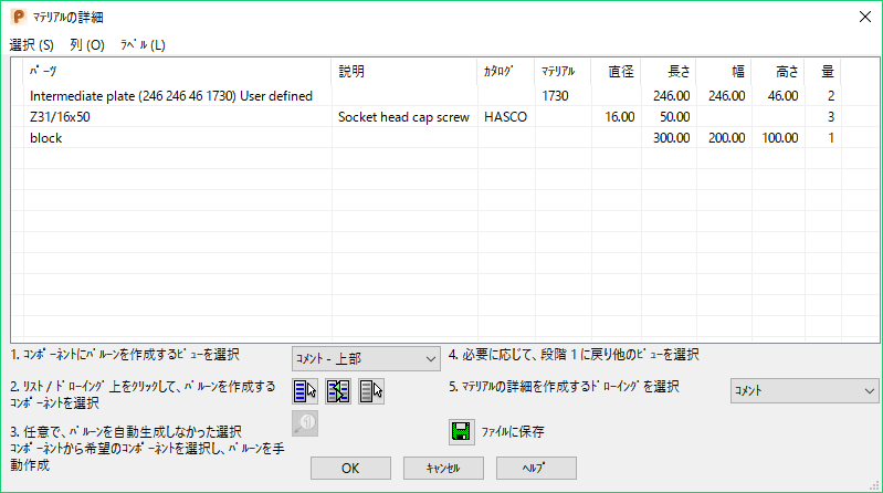 - マテリアルの詳細をドローイング上に作成、または、ファイルに保存します。