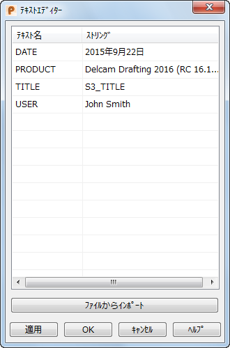テキスト修正 - テキストエディター ダイアログを表示します。ダイアログには、ドローイングに含まれるテキスト名とストリングが表示されます。