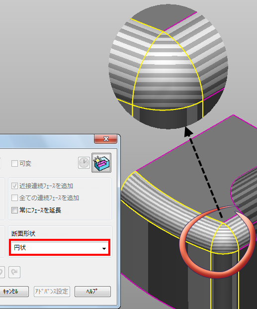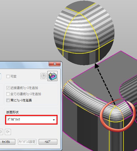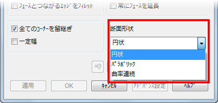 ドロップダウンリストから 断面形状 を選択して、フィレットの断面の形状を変更します。