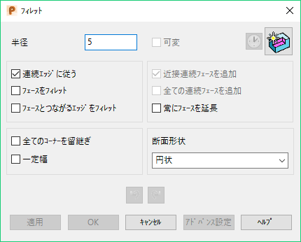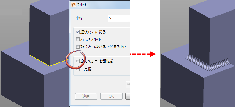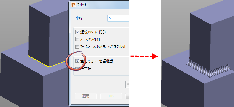 適用 と共に作成モードボタンと編集モードボタンを使用して、ダイアログを閉じずに、希望の数のフィレットを作成、編集することができます。そのため、次のシーケンスで操作することができます。