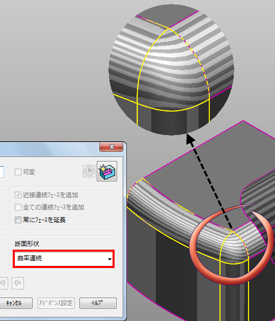 使用するオプションはモデルによって異なります。モデルに対して、最もスムースなフィレット効果のあるオプションを選択します。