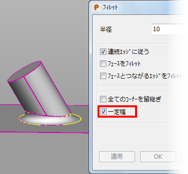 エッジを選択すると、そのエッジと、そのエッジと接線連続する全てのエッジを含む新規フィレットパスが選択されます。連続エッジに従う とエッジ