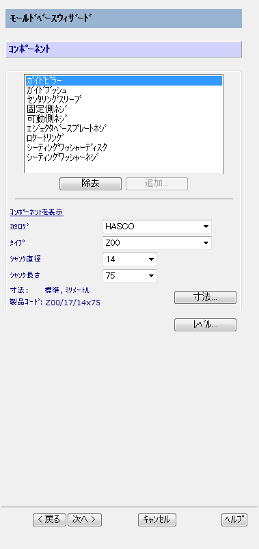 このウィザードでは、選択したモールド ベースのサイズとプレートの厚さが一致する長さと寸法を持つピラー、ブッシュ、スリーブ、ネジのコンポーネント カタログを検索します。
