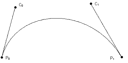通常、PowerShape で作成されるカーブは、ベジェ カーブと呼ばれるパラメトリック 3 次曲線になります。この図では、カーブのスパンは、その終点でその接線上に存在する 2 つのコントロールポイントで定義されます。次の図を参照して下さい。C0 は終点 P0 のコントロール ポイントで、C1 は終点 P1 のコントロール ポイントです。