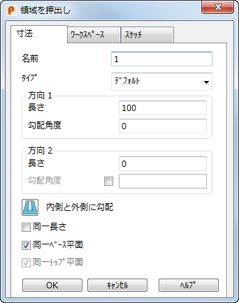 [寸法]タブのオプション([名前]オプションを除く)は、領域を押し出し操作中に使用することもできます。必要に応じて、ソリッドの[名前]を入力します。または、PowerShape によって割り当てられる既定の名前を使用します。