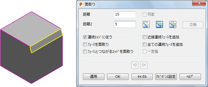 をクリックして、2 つの距離を持つ面取りを作成します。次図のモデルでは、