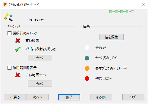 古い結果 / 最新の結果 - 最終エラーチェック以降に、ライン、または、冷却孔を編集した場合、「古い」結果とみなされます。