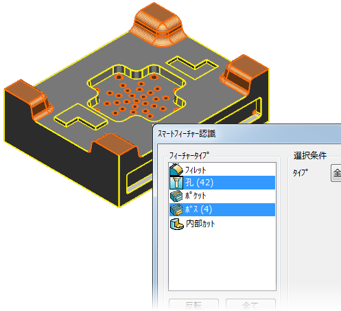 - [ソリッド]タブ > [フィーチャ]パネル > [スマートフィーチャ認識]をクリックして、[スマートフィーチャ認識]ダイアログを表示します。