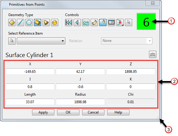 - 作成、または、編集するアイテムタイプに基づき、複数の項目が表示されます。 ジオメトリのサイズと位置を定義します。 項目に値を入力して、新規ジオメトリを編集します。 アイテムがプロービングで作成された場合、Chi 値は、プロービングしたポイントへの、作成したジオメトリのフィット精度を示します。 Chi 値が低いほど、フィット精度は高くなります。