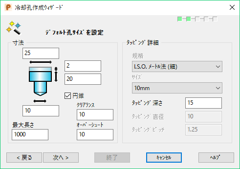 これらの値は、孔のプレビュー作成に使用されます。ウィザードの後のステップで、作成前の各孔を編集することができます。