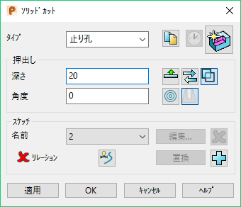 をクリックして ソリッドフィーチャーリレーション ダイアログを表示します。これを使用して、フィーチャーのソリッドに対する位置を指定します。リレーション の状態が次のいずれかで示されます。