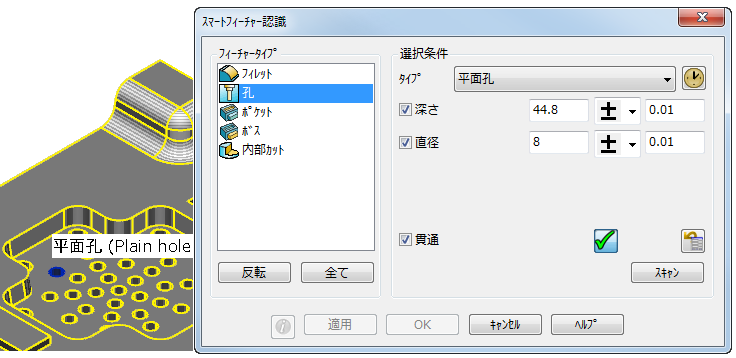 - [ソリッド]タブ > [フィーチャ]パネル > [スマートフィーチャ認識]をクリックして、[スマートフィーチャ認識]ダイアログを表示します。