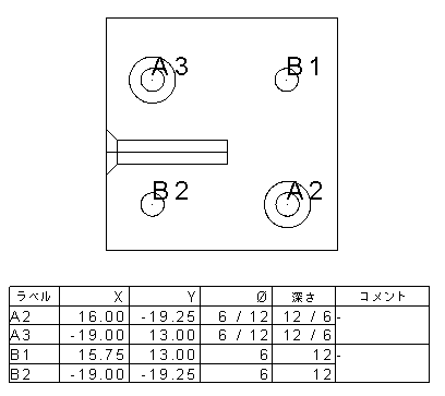 表では、同じ孔タイプから作成された全孔がグループ化されています。表には、孔の中心、直径、深さが記載されています。
