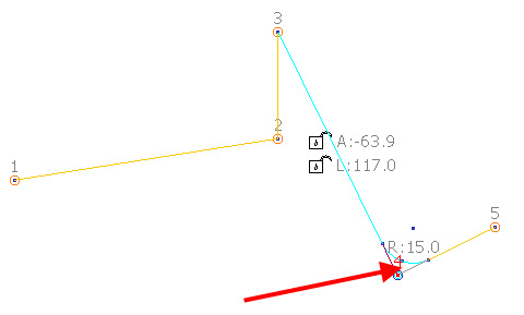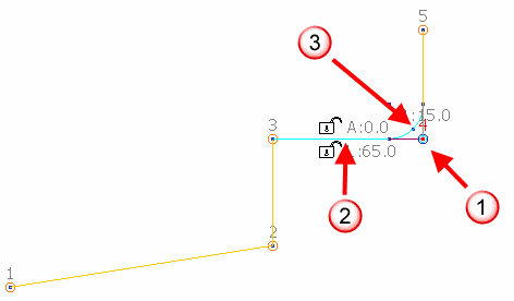 このモードで、選択ポイント以降のポイントがドラッグされますが、選択ポイントに隣接するスパンの間の角度は保持されます。 次図の矢印で示されているように、一定の角度を保ちます。