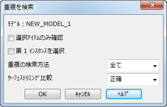 - モデル - オブジェクトの重複検出の対象となるモデルの名前です。 デフォルトで、アクティブモデルになります。 グラフィック ウィンドウでクリックするか、[ビュー]タブ > [ウィンドウ]パネル > [ウィンドウ]リストから選択することにより、別の開いたモデルを選択することができます。